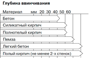 - глубины ввинчивания в каменную кладку;