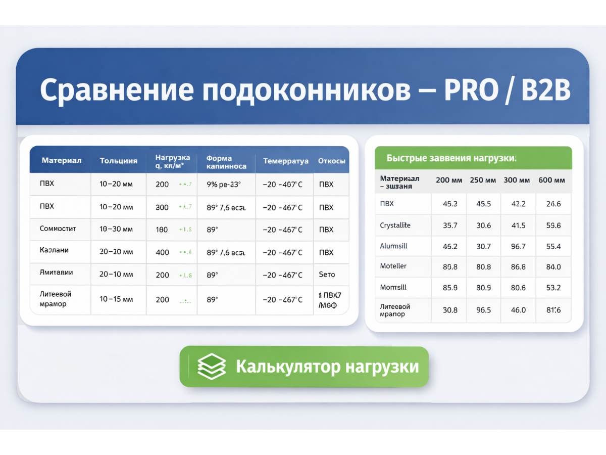 Сравнение подоконников по материалам, форме капиноса, допустимым нагрузкам, температурным режимам и условиям монтажа. Страница предназначена для монтажников, проектировщиков и дилеров.