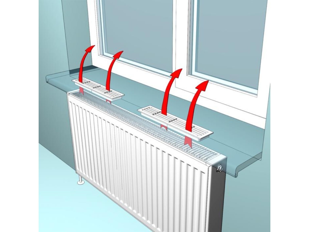 При наличии вентиляционной решётки тёплый воздух от радиатора свободно поднимается вверх через отверстия в подоконнике. Это снижает температурный перепад на поверхности окна и предотвращает образование конденсата.